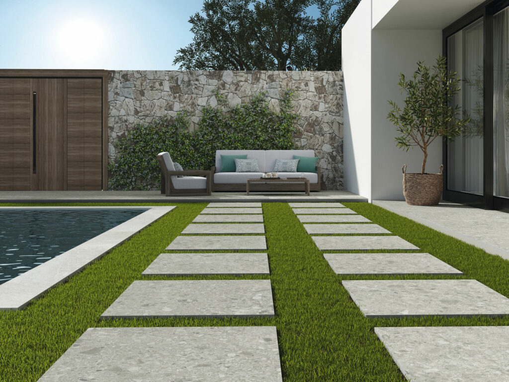 Il reproduit parfaitement l’aspect brut et authentique de la pierre, tout en étant plus facile d’entretien. Les teintes beige, gris ou sable s’intègrent naturellement dans un jardin.