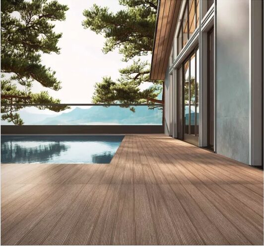Il recrée l’esprit d’une plage en bois sans les contraintes du matériau naturel.